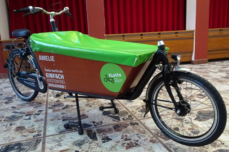Amelie ist ein flinkes zweirädriges Bakfiets CargoBike Classic Long, das der fLotte vom Centre Français de Berlin zur Verfügung gestellt wird.