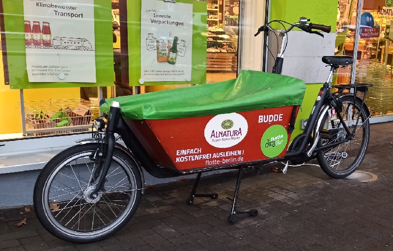 Budde (ehem. Bettina genannt) ist ein flinkes zweirädriges  Bakfiets.nl, zur Verfügung gestellt von Alnatura.