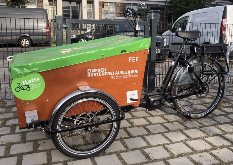 Der Gepäckträger verkraftet weitere 25 kg. Die Kiste und ihr Inhalt kann mit einer fLotte-grünen Abdeckplane geschützt werden. Helme für Kinder und Erwachsene können ebenfalls ausgeliehen werden.
