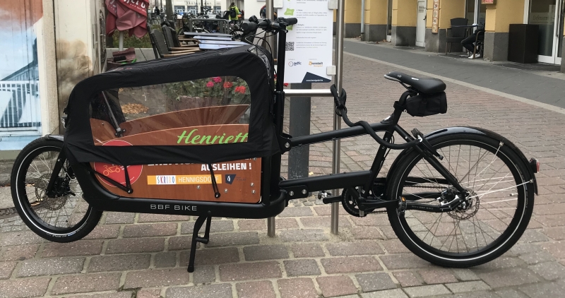 Die Ladekiste ist 68 cm lang, 38 cm breit und trägt bis zu 80 kg. Eine Sitzbank mit Haltegurt für ein Kind samt herausnehmbarem Polster und schickem Regenverdeck machen das Rad zur fröhlichen Kinderkutsche.