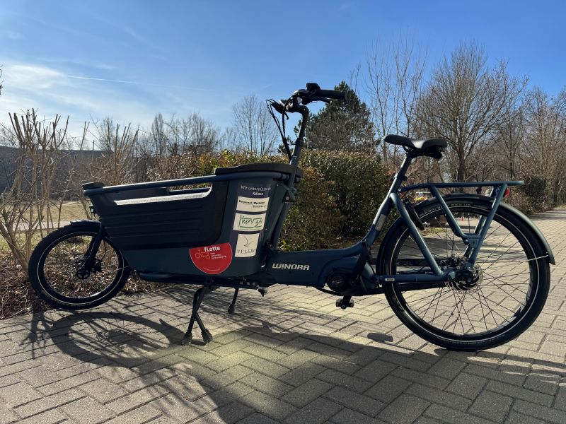 Die Ladekiste ist 1,08 m lang, 72 cm breit und trägt bis zu 100 kg. Eine feste Sitzbank für bis zu 2 Kinder mit Dreipunkt-Sicherheitsgurten machen das Rad zur fröhlichen Kinderkutsche.