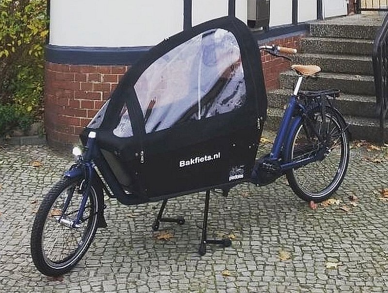Die Ladekiste ist 98 cm lang, 50 cm breit und trägt bis zu 80 kg. Eine umklappbare Sitzbank mit Haltegurten für 2 Kinder und ein Regenverdeck machen das Rad zur fröhlichen Kinderkutsche.