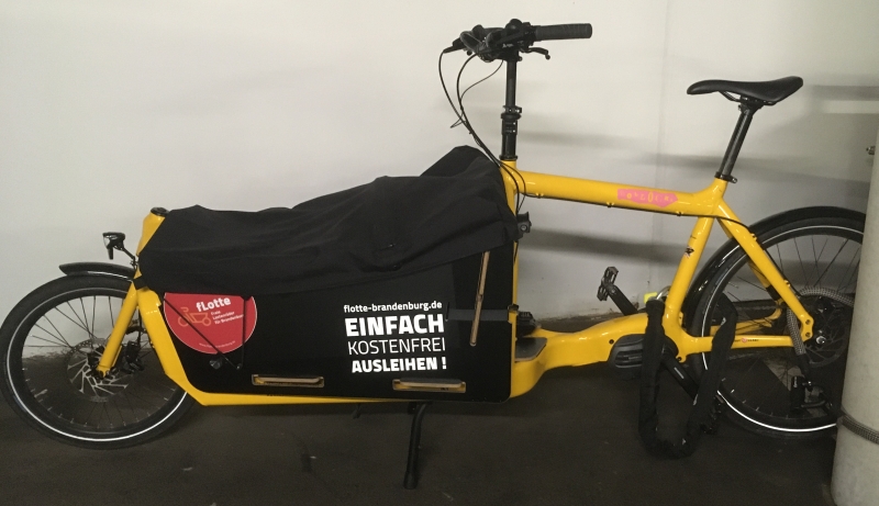 Die Ladekiste ist 65 cm lang, 50 cm breit und trägt bis zu 70 kg. Eine gepolsterte Sitzbank mit Haltegurten für zwei (kleine) Kinder macht das Rad zur fröhlichen Kinderkutsche.