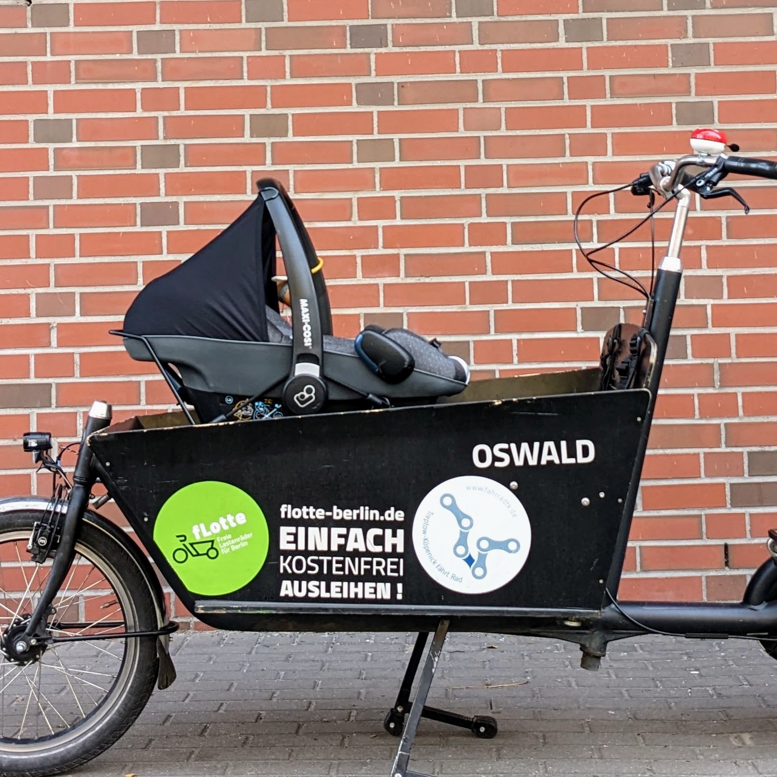 OSWald ist ein flinkes zweirädriges Bakfiets.nl CargoBike Classic Long. Dank 8-Gang-Nabenschaltung mit Freilauf und zuverlässigen hydraulischen Bremsen ist es trotz seiner gut 2,50 m Länge wendig und sicher zu fahren.