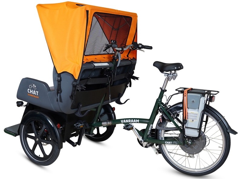 Dank einer 8-Gang Kettenschaltung und einem E-Motor ist die Van-Raam-Rikscha trotz ihrer 2,32 m Länge und 1,11 m Breite wendig und sicher zu fahren. Sie verfügt über eine Anfahrhilfe, eine Tretunterstützung mit drei Stufen und einem Rückwärtsgang.