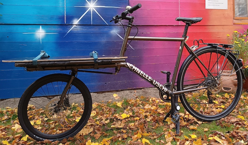 Das Rad hat eine 10-Gang Kettenschaltung, ist 2,10 m lang und 60 cm breit. Die Plattform ist 83 cm lang und 51 cm breit. Euer Ladegut müsst ihr mit Gurten u.ä. sichern.