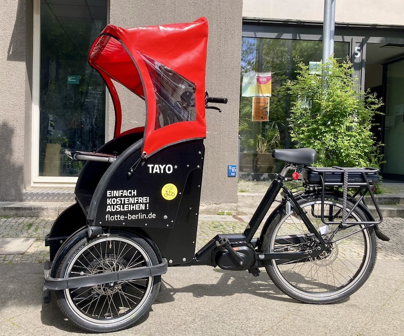 Tayo ist eine Bakfiets Rikscha und kann zwei Passagiere bequem befördern.