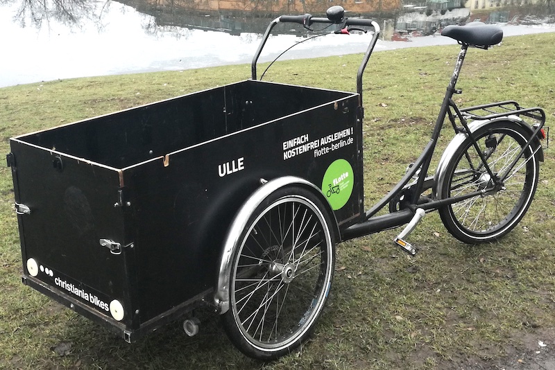 Ulle ist ein dreirädriges Christiania Bike +30 ohne Kinderbank. Seine große Kiste ist innen 118 cm lang und 62 cm breit und kann mit 100kg beladen werden, der Gepäckträger fasst weitere 20kg. Die Vorderseite der Box kann geöffnet werden.