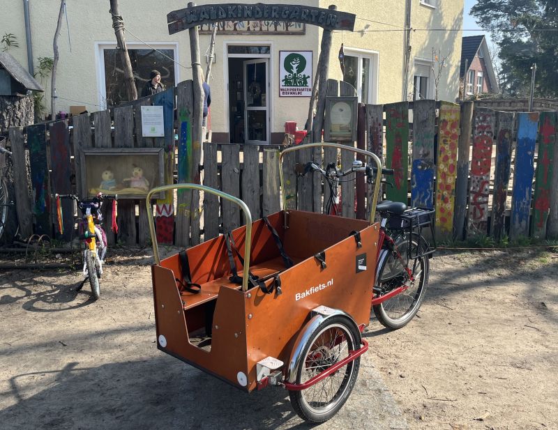 Waldemar ist ein dreirädriges Bakfiets Daycare, dessen Transportkiste 90 cm lang und 67 cm breit ist. In der Transportkiste finden sich Sitzplätze mit Anschnallgurten für 4-6 Kindern.