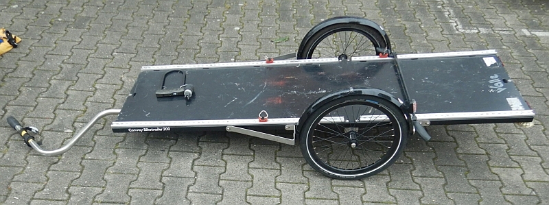 Walle ist ein langer Lastenanhänger (Convoy Biketrailer 200) mit Platte und 2 längsseitigen Hakenleisten und Weber-Kupplung. Mit 200 cm Länge, 60 cm Breite und 50 kg Nutzlast ist die Ladefläche z.B. für langes Sperrgut geeignet.