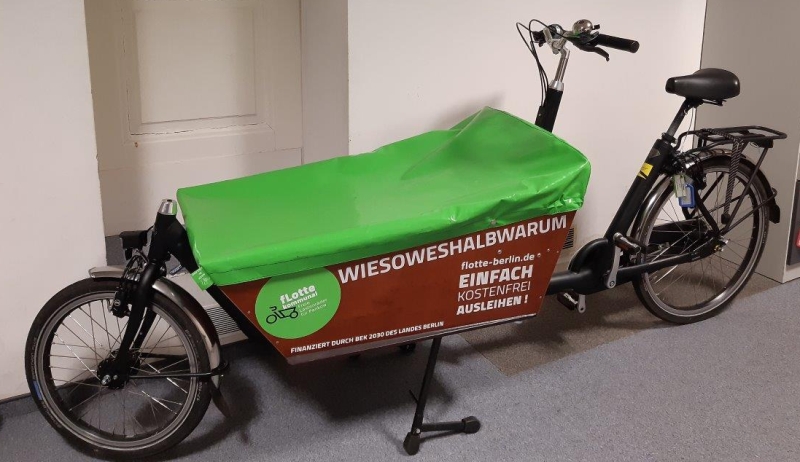 Der Gepäckträger verkraftet weitere 25 kg. Die Kiste und ihr Inhalt kann mit einer fLotte-grünen Abdeckplane geschützt werden.