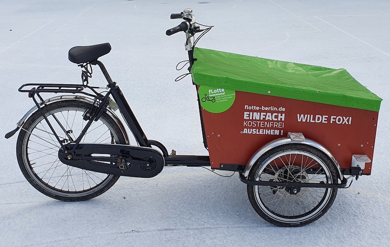 Wilde Foxi ist ein solides dreirädriges Bakfiets CargoTrike Classic Wide, 2,10 m lang und 95 cm breit.