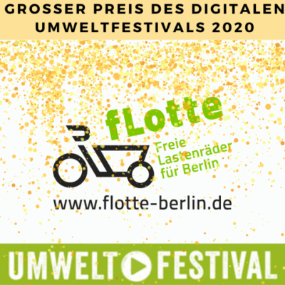 fLott prämiert beim Umweltfestival 2020 Die Grüne Liga Berlin prämiert fLotte Berlin mit der „Besonderen Anerkennung“ auf dem Umweltfestival 2020. Uns ehrt die Auszeichnung sehr! Vielen Dank! Die GASAG hält die Laudatio (ab Minute 13:25):