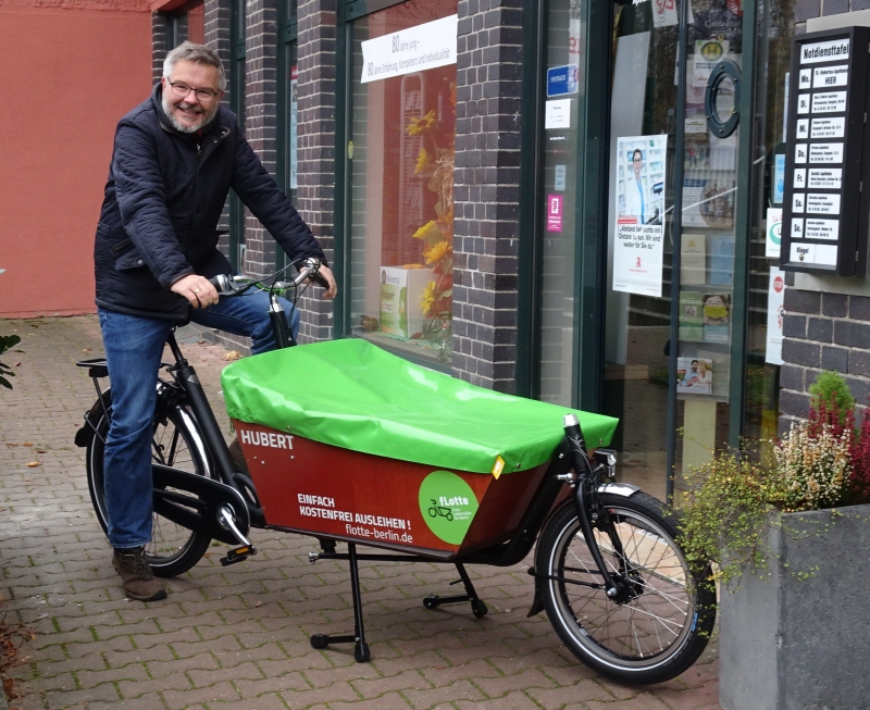 Die fLotte rollt nordwärts: Dank beharrlichem bürgerschaftlichem Engagement gibt es nun den fLotten Hubert, der an der Sankt Hubertus Apotheke beim S-Bahnhof Hohen Neuendorf auf euch wartet (also das Lastenrad namens Hubert wartet dort, nicht der stolze Fahrer Stefan Overkamp, der Vorsitzende des ADFC Brandenburg).