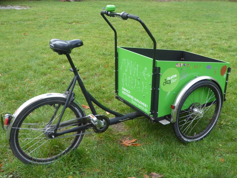 Auch knapp an der Stadtgrenze geht’s zunehmend fLott zu: In Marienfelde-Süd beim „Haus of Fun“ steht nun der fLotte Lasti bereit, ein Christiania Bike mit grasgrüner Kiste. Touren ins Nachbarland sind Lasti bestimmt ein Vergnügen. Noch ist Lasti nicht kindergeeignet, doch eine Kinderbank soll nachgerüstet werden.