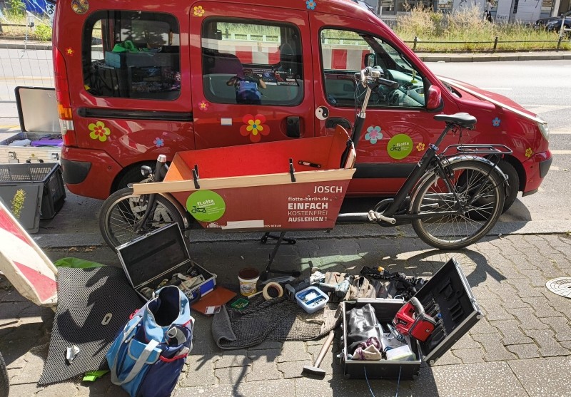 Wir sind vielfältig unterwegs: Von gemeinsamen Wartungstouren mit dem E-Werkstattlasti über Reparaturen vor Ort und in der Werkstatt bis hin zur Aufarbeitung kompletter Gebrauchträder für den fLotten Verleih. Dazu organisieren wir freiwillige Schulungen durch Profis zu den technischen Themen, die euch interessieren.