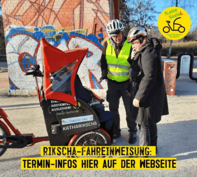 Wir bitten um eine verbindliche Anmeldung per email (begrenzte Platzzahl) an sozial@flotte-berlin.de. Treffpunkt für das Rikscha-Fahrtraining ist der Hof der Evangelischen Luther-Kirchengemeinde in der Bülowstraße 71/72 in Schöneberg.